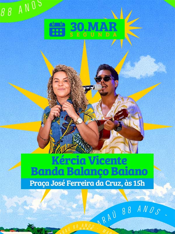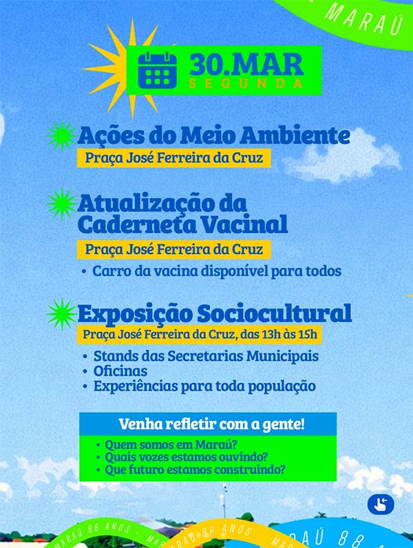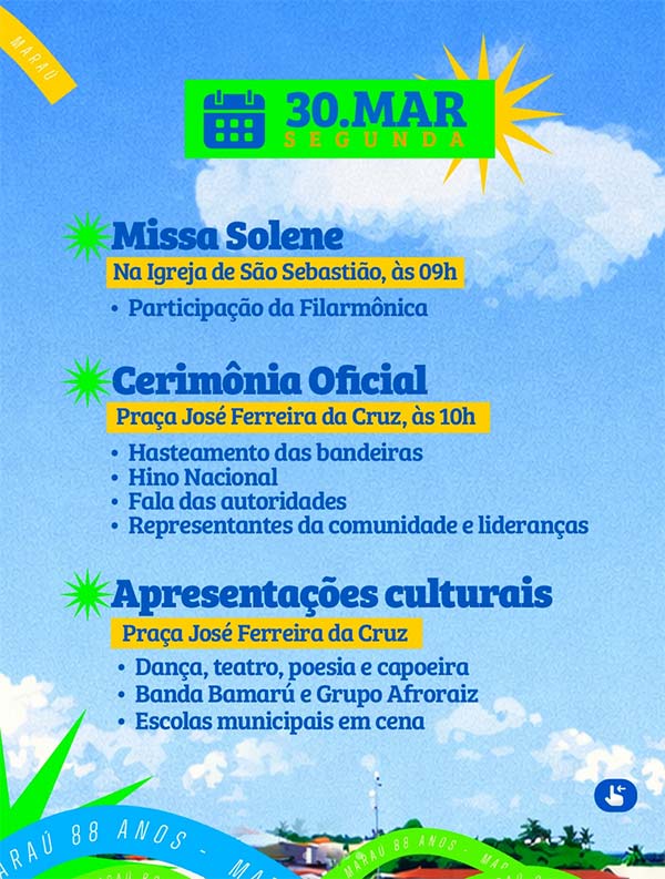 Maraú está em festa, com uma programação especial para celebrar os 88 anos da cidade, valorizando a história, a gente e tudo aquilo que os une. Serão dias de muita cultura, esporte, encontros e momentos que fortalecem a identidade local e apontam caminhos para o futuro. Participe, leve sua família e viva essa grande celebração juntos! Maraú somos nós: identidade, vozes e caminhos para o futuro!