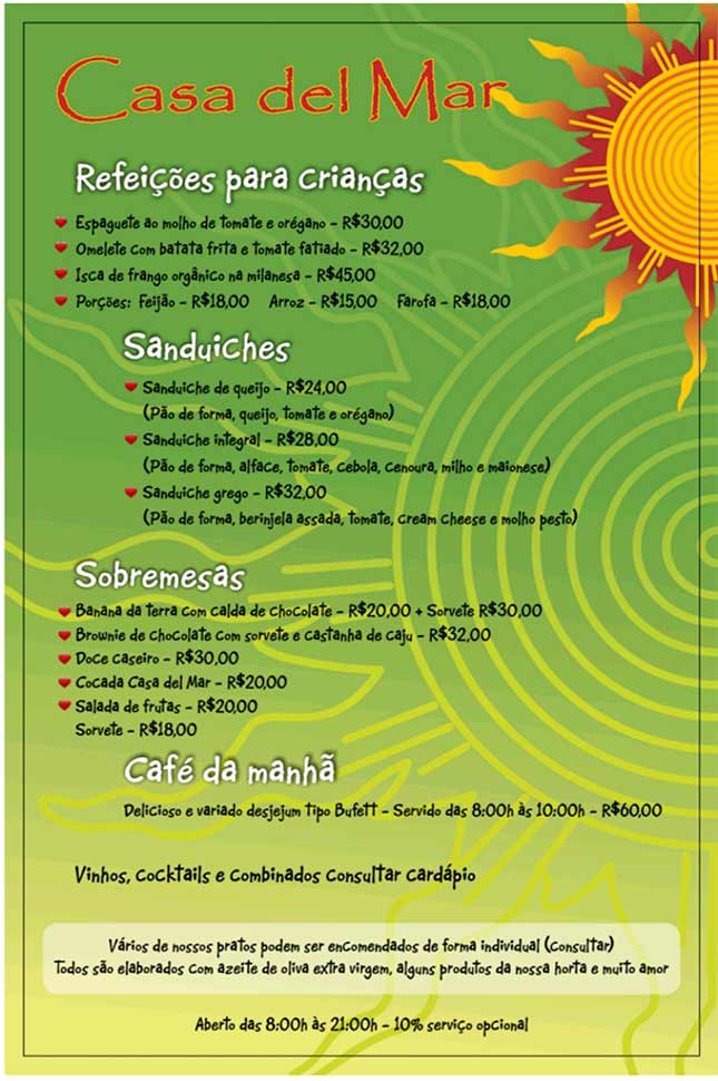 Localizado em frente ao mar, o charmoso restaurante de madeira é um dos grandes atrativos da Casa del Mar. Cuidando da alimentação, usando produtos orgânicos, de agricultores da região, bem como de sua própria horta, sempre elaborados com azeite de oliva extra-virgem e muito amor. Oferece desde um equilibrado e delicioso café da manhã, até diferentes pratos da culinária nacional e internacional.